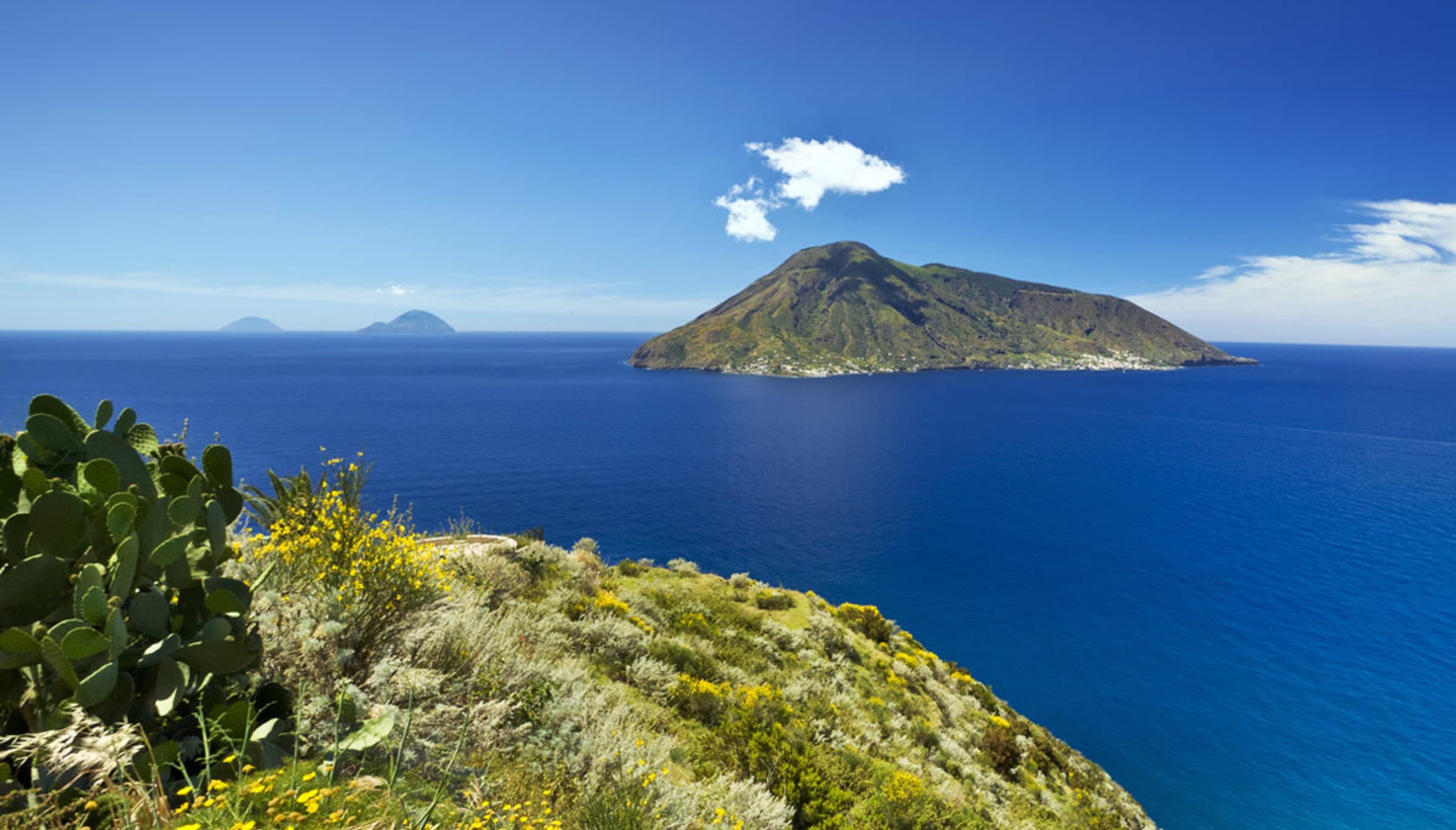 La cima dell'isola a 675 m, lungo il sentiero dei mulattieri e i suoi gradini in pietra vulcanica. Vista a 360° su tutto l'arcipelago: Stromboli che fuma, Filicudi, Salina, Lipari, Vulcano — e la Sicilia in lontananza nelle giornate limpide.